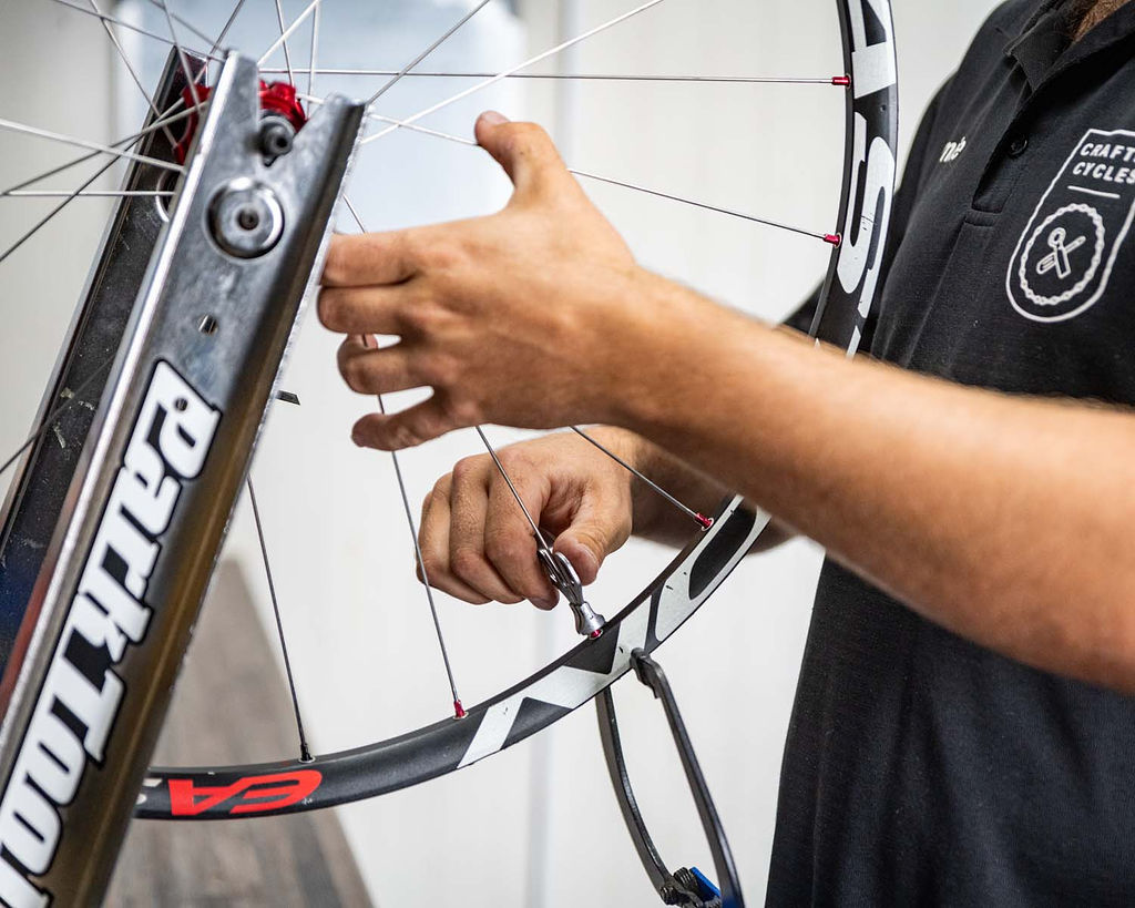 Adjusting the spoke tension to correct any lateral (side-to-side) or radial (up and down) wobble in the rim.